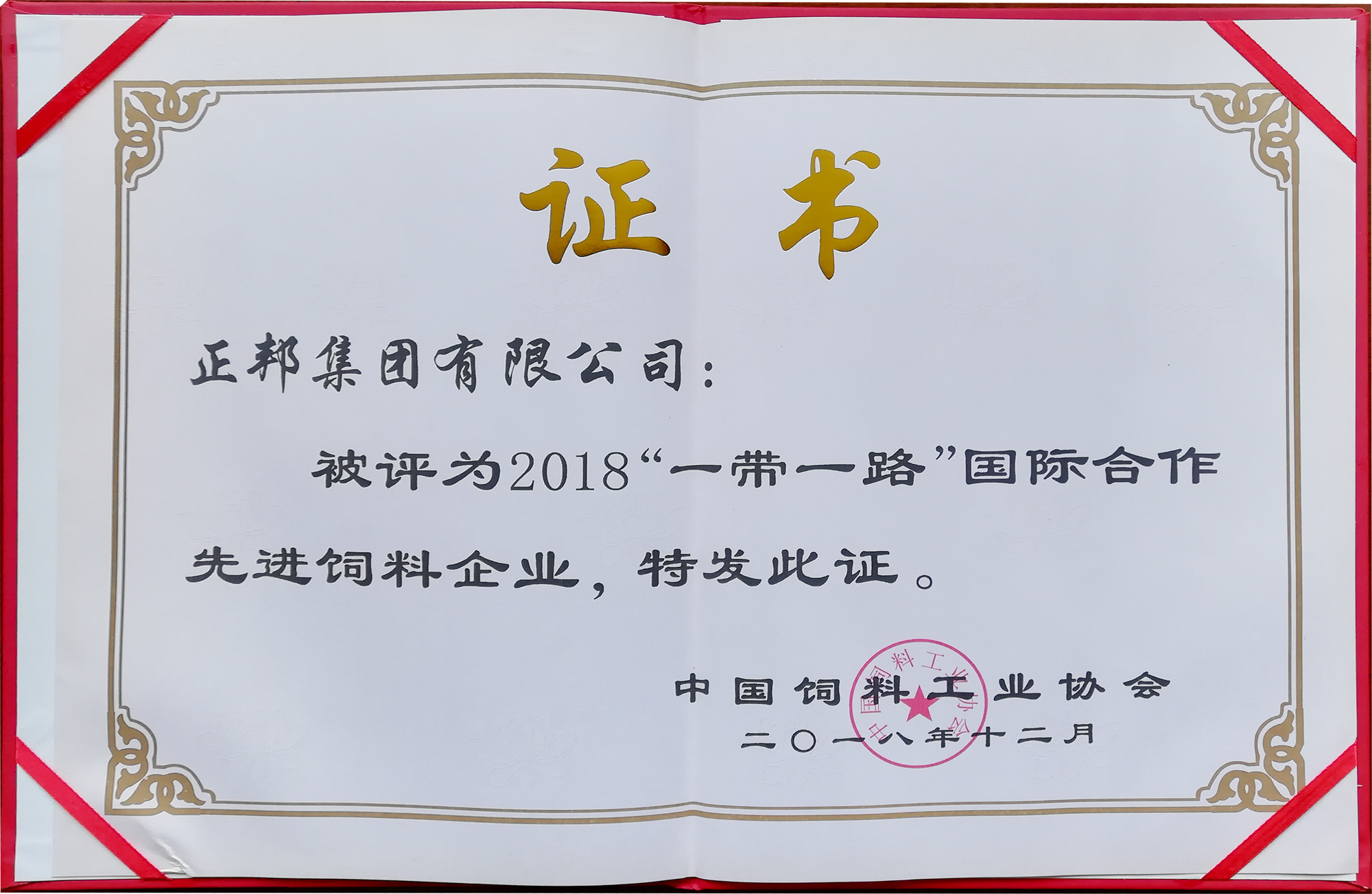 2018一帶一路國際合作先進(jìn)飼料企業(yè)證書